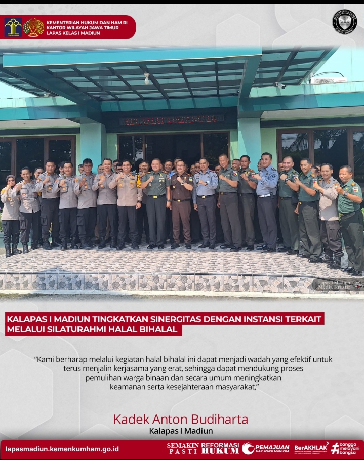 Madiun, Memoterkini com – Dalam rangka mempererat kerjasama dan membangun sinergitas antar instansi, Kalapas Kelas I Madiun Kanwil Kemenkumham Jatim, laksanakan kegiatan silaturahmi Halal Bihalal dengan sejumlah instansi terkait di wilayah Madiun. Kegiatan ini merupakan bagian dari upaya Lapas I Madiun untuk meningkatkan koordinasi dan kolaborasi dalam berbagai bidang, terutama dalam peningkatan layanan dan keamanan pemasyarakatan, Selasa (16/04).