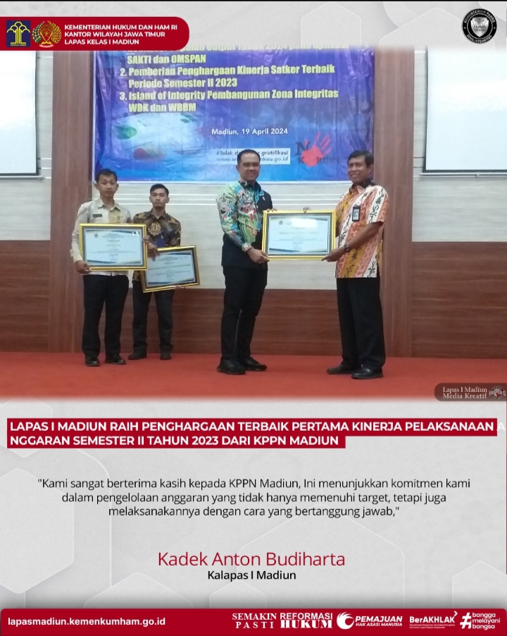 Madiun, Memoterkini.com – Lembaga Pemasyarakatan Kelas I Madiun Kanwil Kemenkumham Jatim menerima penghargaan sebagai pelaksana anggaran terbaik untuk semester II tahun 2023. Penghargaan ini diberikan oleh Kantor Pelayanan Perbendaharaan Negara (KPPN) Madiun dalam sebuah acara yang diadakan di Aula Piet Harjono KPPN Madiun, Jum’at (19/04).