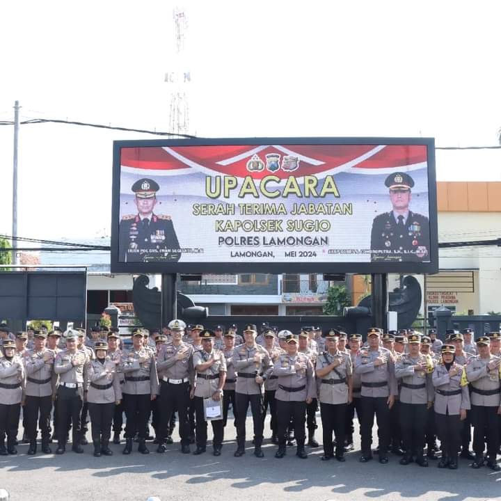Lamongan,memoterkini – Kapolres Lamongan AKBP Bobby A Condro Putra, S.H., S.I.K., M.Si. memimpin langsung Upacara Serah Terima Jabatan Kapolsek Sugio Polres Lamongan dari pejabat lama AKP Lukman Hadi S.H yang di gantikan oleh pejabat baru AKP Supardi S.H yang sebelumnya menjabat sebagai Kasubbag Binops BagOps Polres Lamongan. Senin (6/5/2024)