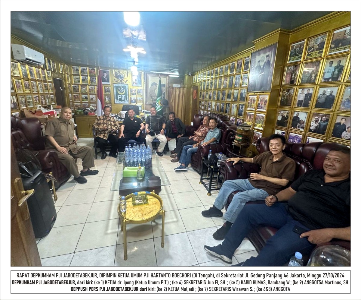Jakarta, memoterkini – Ketua Umum Persatuan Jurnalis Indonesia (PJI), Hartanto Boechori, resmi menunjuk dr. Ipong Wijaya Kusuma sebagai Ketua Depkumham PJI Jabodetabekjur (Jakarta, Bogor, Depok, Tangerang, Bekasi, Cianjur) melalui Surat Mandat No. 070/SPNJ/DPP PJI/X/2024. Dalam Mandatnya, Boechori menunjuk The Hembing Center jalan Gedong Panjang 46 Jakarta sebagai sekretariat Depkumham PJI Jabodetabekjur.