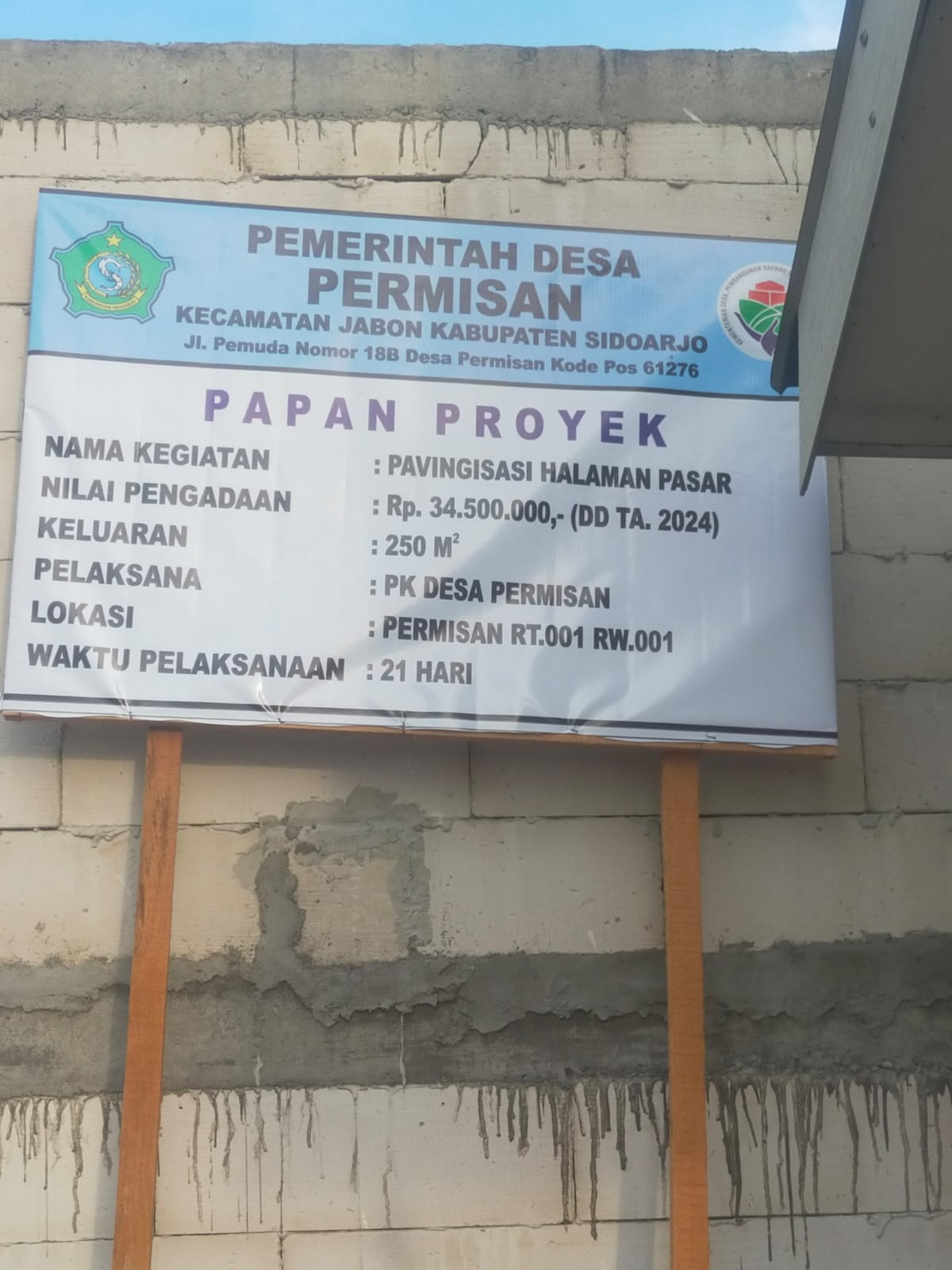 Anggaran proyek pavingisasi ini bersumber dari anggaran DD tahap 2 2024 Kabupaten Sidoarjo Tahun 2024 atas usulan Kepala Desa permisan H.Mudjito menyampaikan dengan tegas dengan Volume pekerjaan 250 Meter Agar halaman pasar terlihat makin luwas dan pernah Nayaman buat pengunjung.