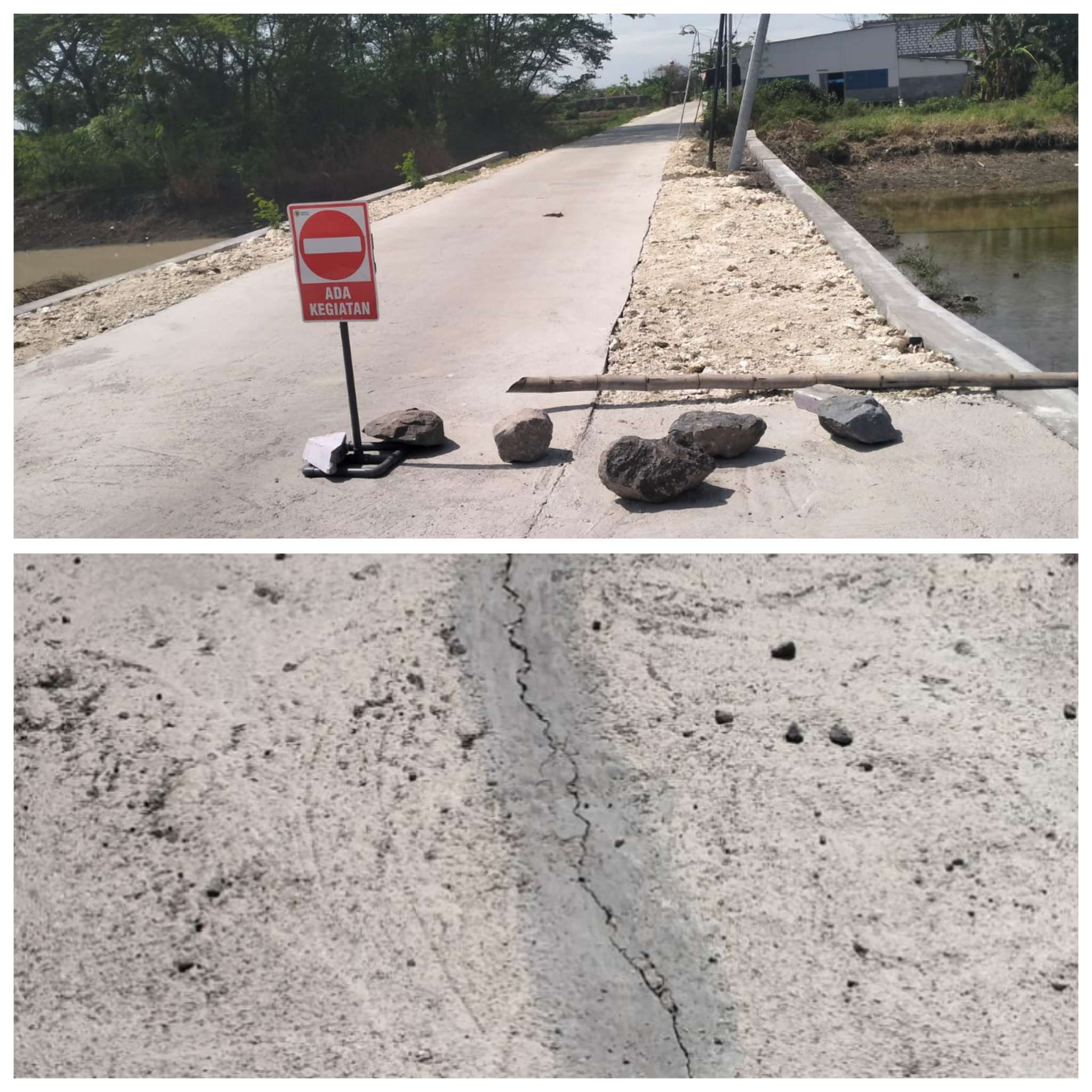 Betapa tidak ketika baru selesai dibangun saja dan palang peringatan penutup jalan belum resmi dibuka oleh pemerintah desa untuk dipergunakan secara umum untuk masyarakat dan belum digunakan untuk akses jalan kendaraan roda 4 jalan tersebut sudah rusak dan mengalami retak-retak di beberapa titik dan terlihat sebagian ada yang mengelupas dan di tambal.