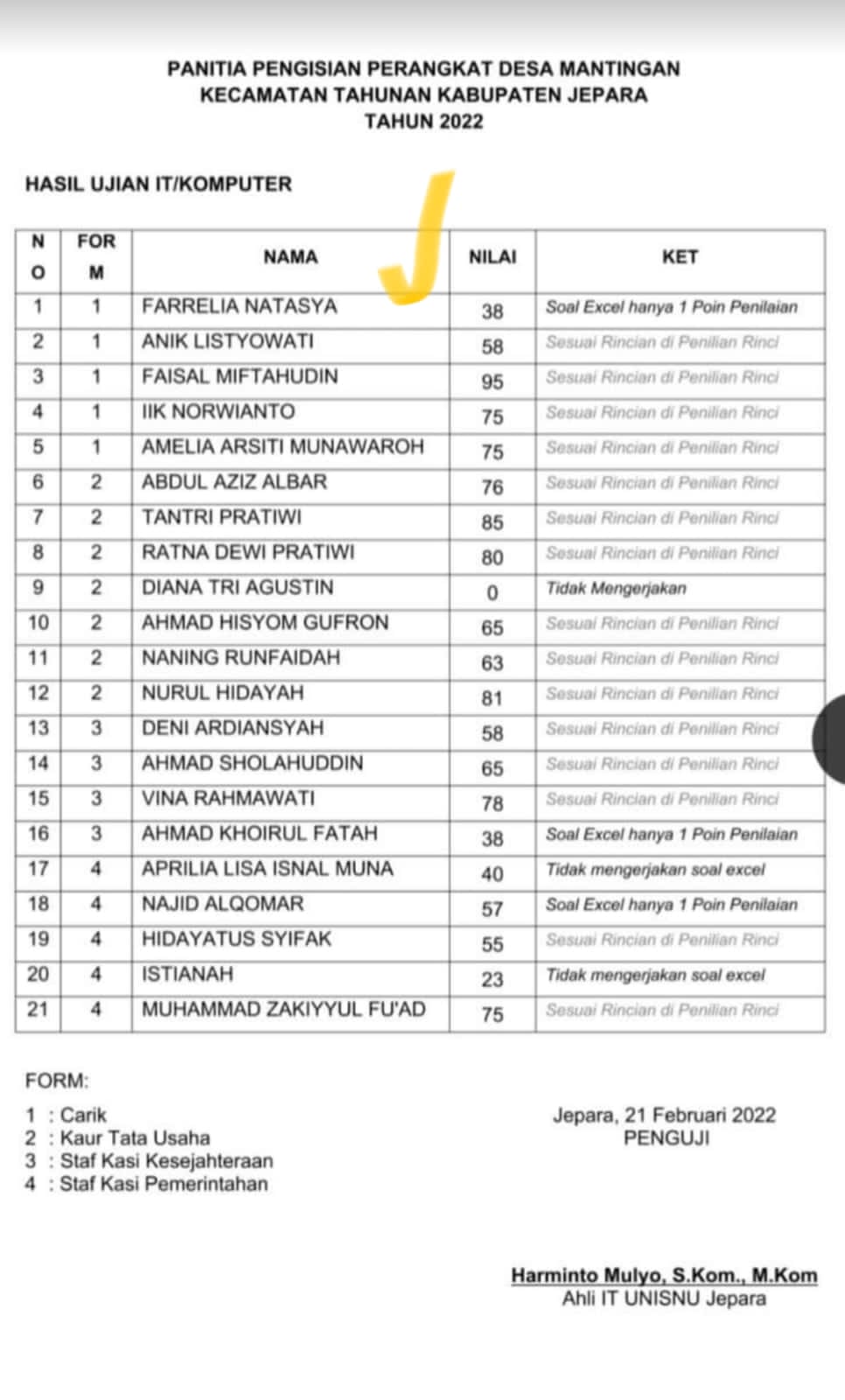Pengangkatan Sekretaris Desa berinisial FN patut dipertanyakan dengan nilai rendah 38 ketimbang yang punya nilai 95 , fakta dugaan rekayasa terpilih menjadi Sekretaris Desa.