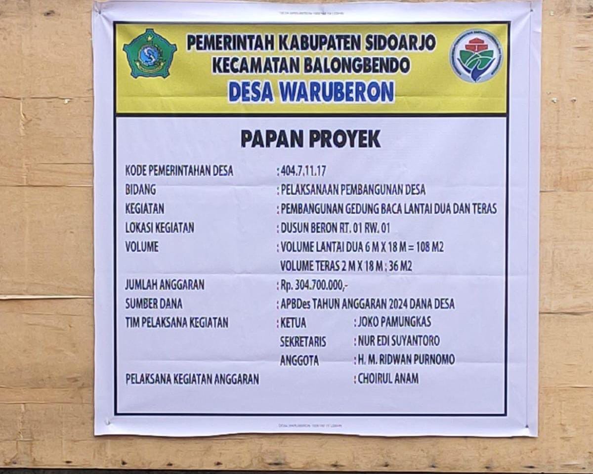 Sidoarjo: Memoterkini.com. Pemdes Waruberon kecamatan balungbendo kabupaten Sidoarjo melaksanakan pembangunan gedung Baca Lantai dua dan teras Hingga 90%,Di dusun Beron RT 01 RW 01, volume Lantai dua 6M X 18 M,=108 M2, volume Teras 2 M 18 M. =36 M2, Jumlah Anggaran Rp 302,700,000 Sumber Dana APBDes Tahun Anggaran 2024 Dana Desa ,