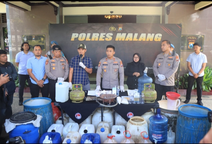 “Kami mendapat pengaduan dari warga melalui layanan 110 terkait dugaan aktivitas produksi miras ilegal. Informasi tersebut langsung kami tindak lanjuti,” kata Kompol Bayu dalam konferensi pers di Polres Malang, Kamis (19/6/2025).