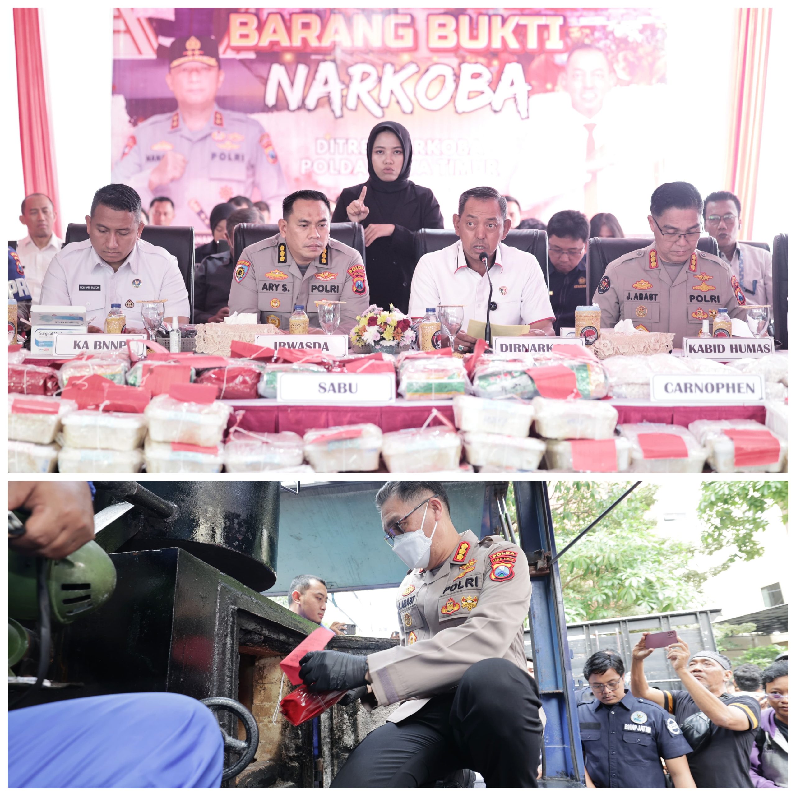 Barang bukti yang dimusnahkan mencakup, Sabu: 49.054,582 gram, Ekstasi: 2.860 butir, Carnophen (Pil dobel L): 1.077.840 butir, Okerbaya: 5.688.600 butir.