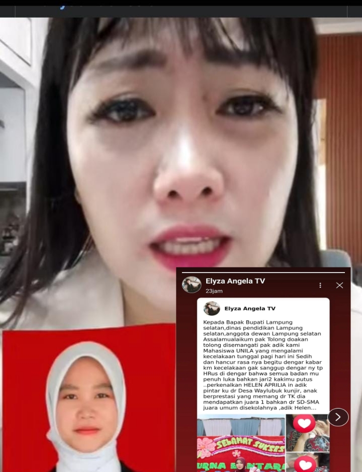 ”Saya ingin mengangkat satu putri berasal dari desa Kunjir, Kecamatan Rajabasa, Lampung Selatan, putri ini sangat berprestasi dari anak usia dini hingga SMA memang mendapat ranking satu terus menerus lulusan tahun ini bersekolah di SMA Negeri Satu Rajabasa, namanya Helen Aprila. Helen ini mendapatkan biaya siswa di Unila. Kenapa Eliza menyebutkan bahwa anak tersebut layak dibantu dan di support, anak yang bernama Helen ini memiliki semangat yang luar biasa dan terkendala di biaya kehidupannya. Kami sebagai rakyat punya hak menyuarakan keluhan rakyat lainnya kami sangat memahami bahwa beban bapak atau ibu pemerintah terkait tidak lah mudah. Maka dari vidio ini saya jelaskan supaya bapak Gubernur dan Bupati Lampung Selatan serta dinas terkait agar dapat menyempatkan waktu melihat kondisi anak tersebut,” jelasnya