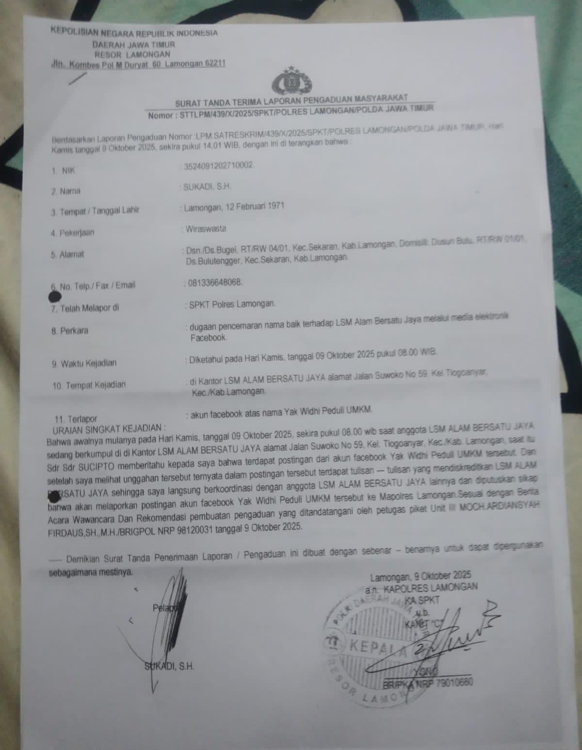 Laporan dengan nomor registrasi LPM SATRESKRIM/439/X/2025/SPKT/Polres Lamongan/Polda Jatim tersebut ditandatangani oleh Sukadi, S.H., Ketua LSM HJM, dan didampingi oleh Rohmat, S.P., pengurus LPKN yang juga menjabat sebagai Bendahara Umum Aliansi.
