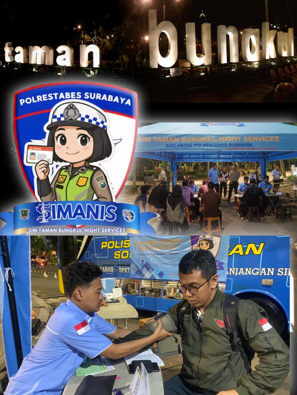 SURABAYA, Memoterkini.com – Satuan Lalu Lintas (Satlantas) Polrestabes Surabaya terus menghadirkan inovasi layanan publik. Kali ini, masyarakat dapat menikmati kemudahan perpanjangan Surat Izin Mengemudi (SIM) pada malam hari melalui program SIM Taman Bungkul Night Services (SIM Manis).