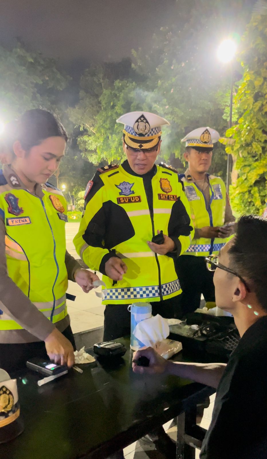 “Beberapa waktu lalu, ada kecelakaan tunggal yang ternyata pengemudinya dalam pengaruh alkohol. Makanya, malam ini kita gelar razia khusus mobil untuk tes kandungan alkohol,” ujar Kompol Su’ud.