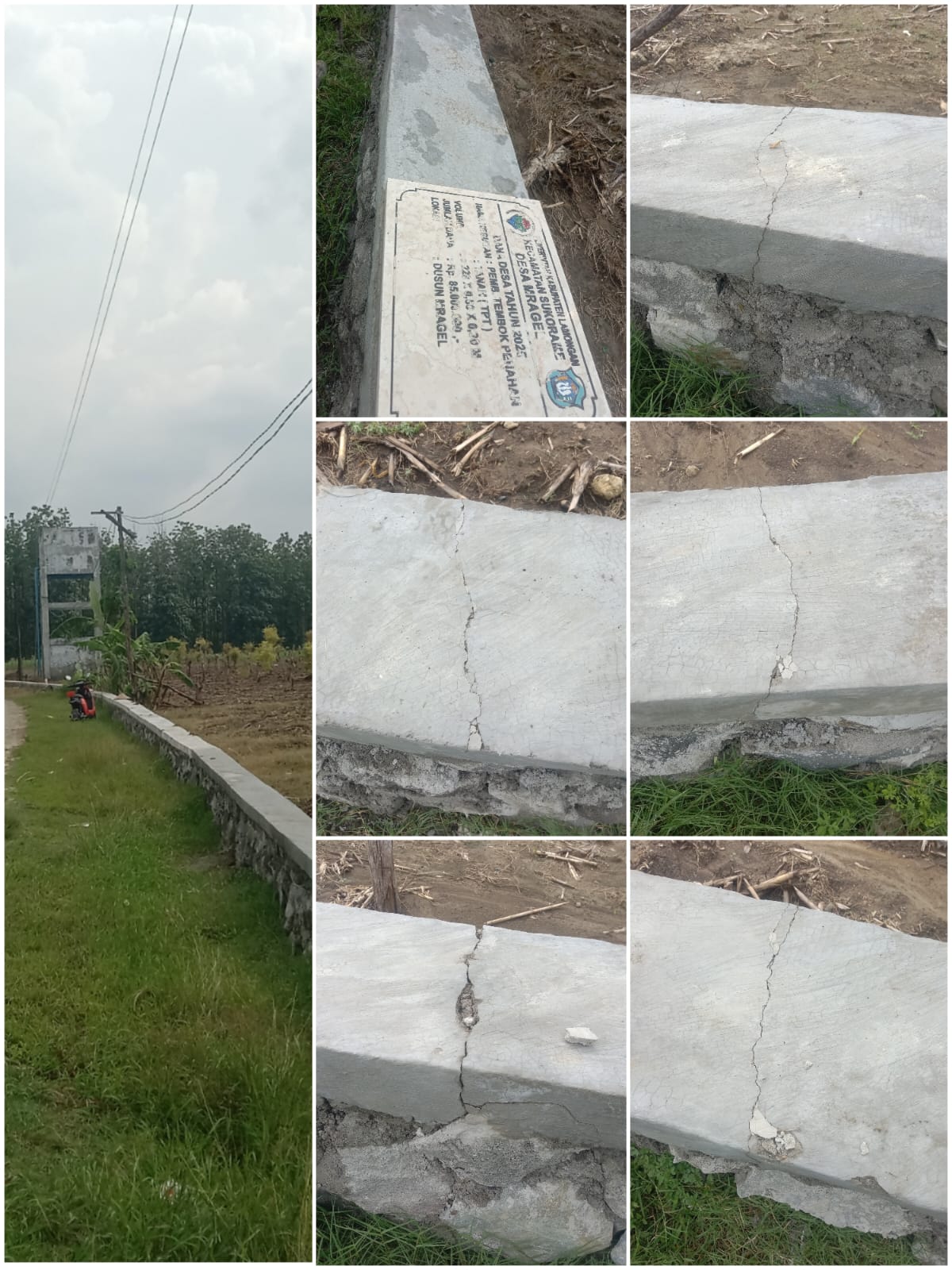 Proyek pembangunan Tembok Penahan Tanah (TPT) di Dusun Mragel, Desa Mragel, Kecamatan Sukorame, Kabupaten Lamongan, yang bersumber dari Dana Desa (DD) Tahun Anggaran 2025 diduga bermasalah. Pasalnya, bangunan dengan nilai anggaran Rp85 juta itu kini tampak retak dan pecah di beberapa titik, padahal baru selesai dikerjakan beberapa minggu lalu.
