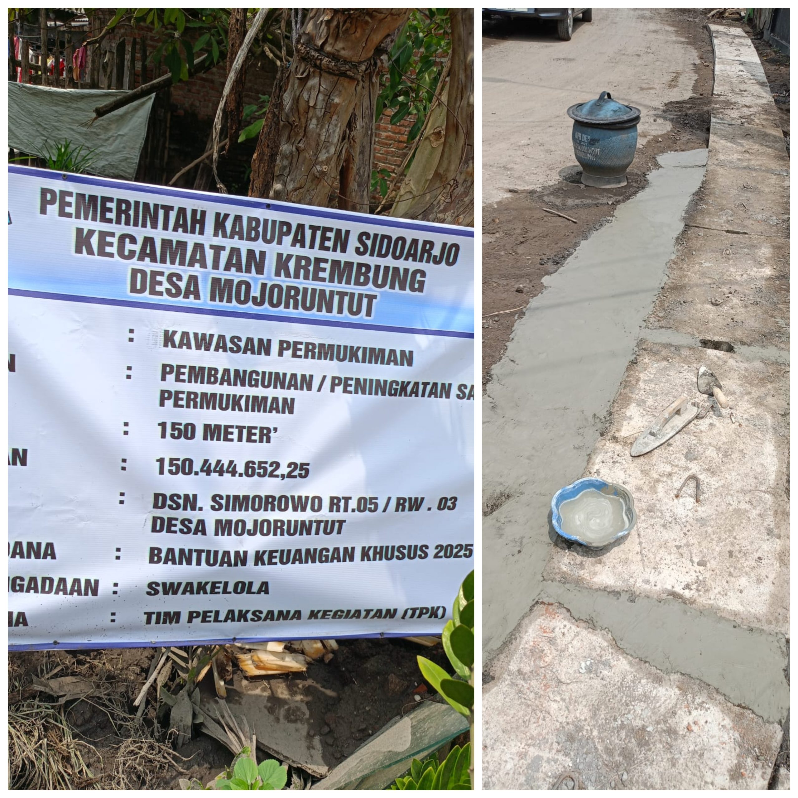 kegiatan pembangunan peningkatan Saluran irigasi permukiman. Volume 150 meter, lokasi Dusun Simorowo,desa Mojoruntut. Sumber dana bantuan ke uangan khusus (BKK) 2025 pengadaan Sewakelola pelaksana. Tim pelaksana kegiatan TPK desa Mojoruntut