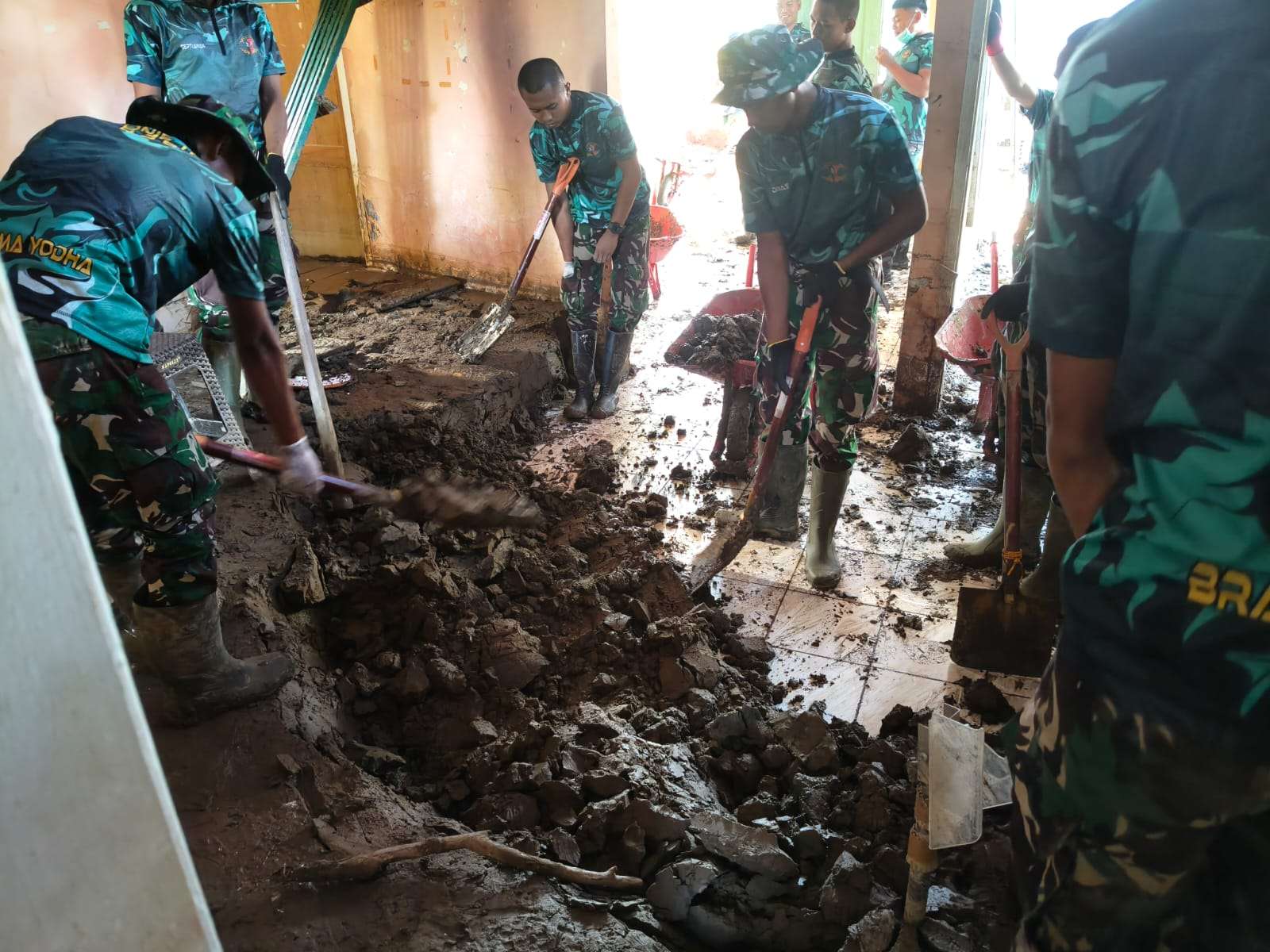 Dipimpin langsung oleh Danyon, para prajurit bersama masyarakat setempat bergotong royong membersihkan lumpur, sampah, serta material sisa bencana yang menumpuk di lingkungan fasilitas umum. Kehadiran prajurit TNI di lapangan mendapat sambutan positif dari warga yang turut serta dalam kegiatan tersebut.