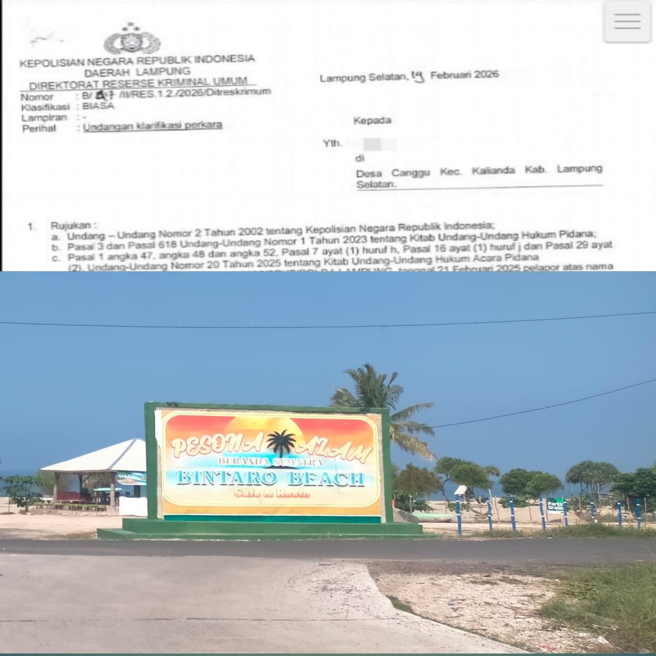 Terkait dugaan penyerobotan tanah di kawasan pantai bintaro Kelurahan Way Urang, Kecamatan Kalianda, Kabupaten Lampung Selatan. Laporan ini ditujukan kepada Dwiki Darmawan anak dari M ALI Desa Canggu, kecamatan Kalianda, Kabupaten Lampung Selatan, selaku pengelola Pantai Bintaro.