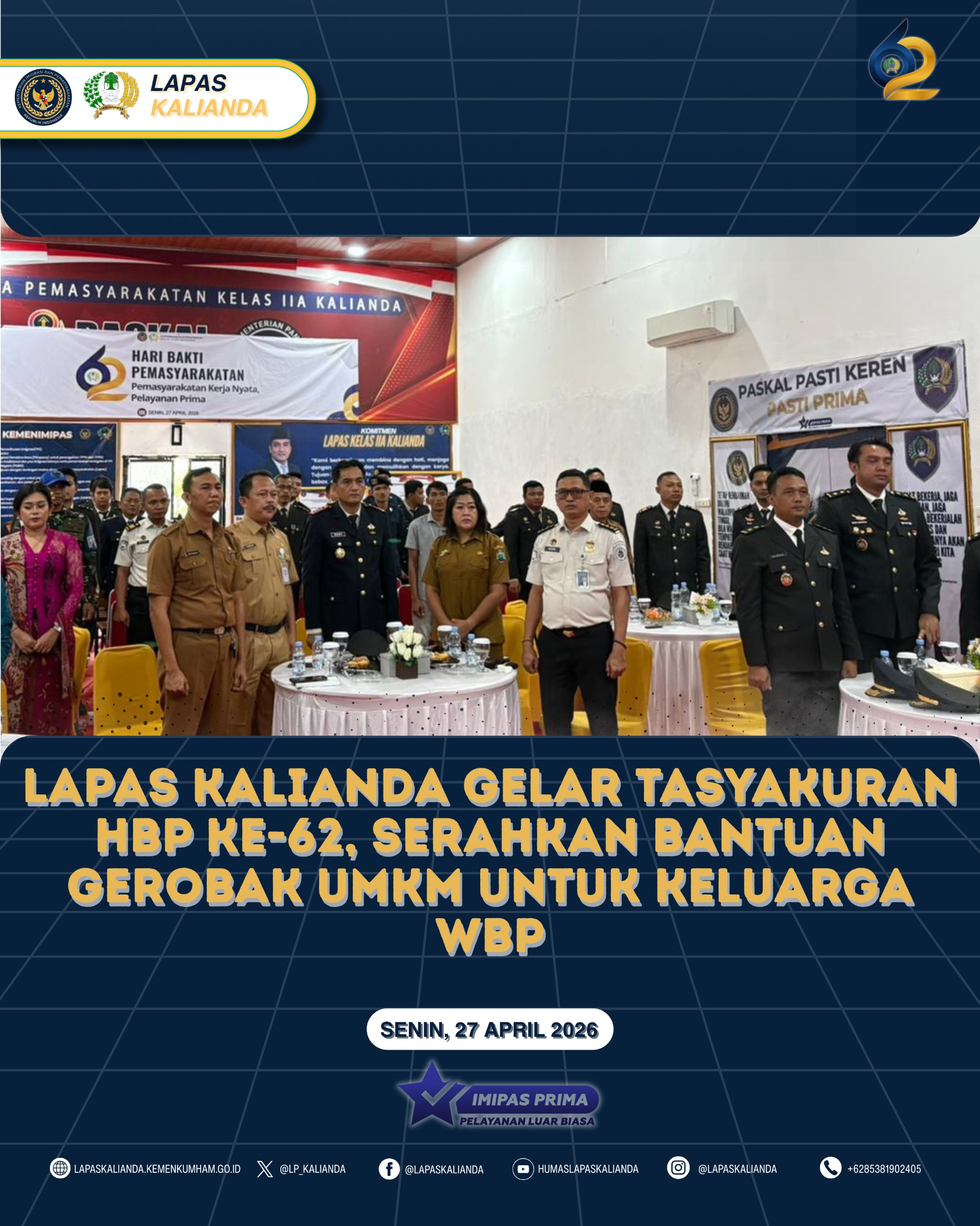Kalianda – Lembaga Pemasyarakatan Kelas IIA Kalianda melaksanakan kegiatan tasyakuran dalam rangka memperingati Hari Bakti Pemasyarakatan ke-62 yang digelar di lingkungan Lapas Kalianda. Kegiatan ini menjadi wujud rasa syukur sekaligus momentum memperkuat semangat pengabdian seluruh jajaran pemasyarakatan (27/4).
