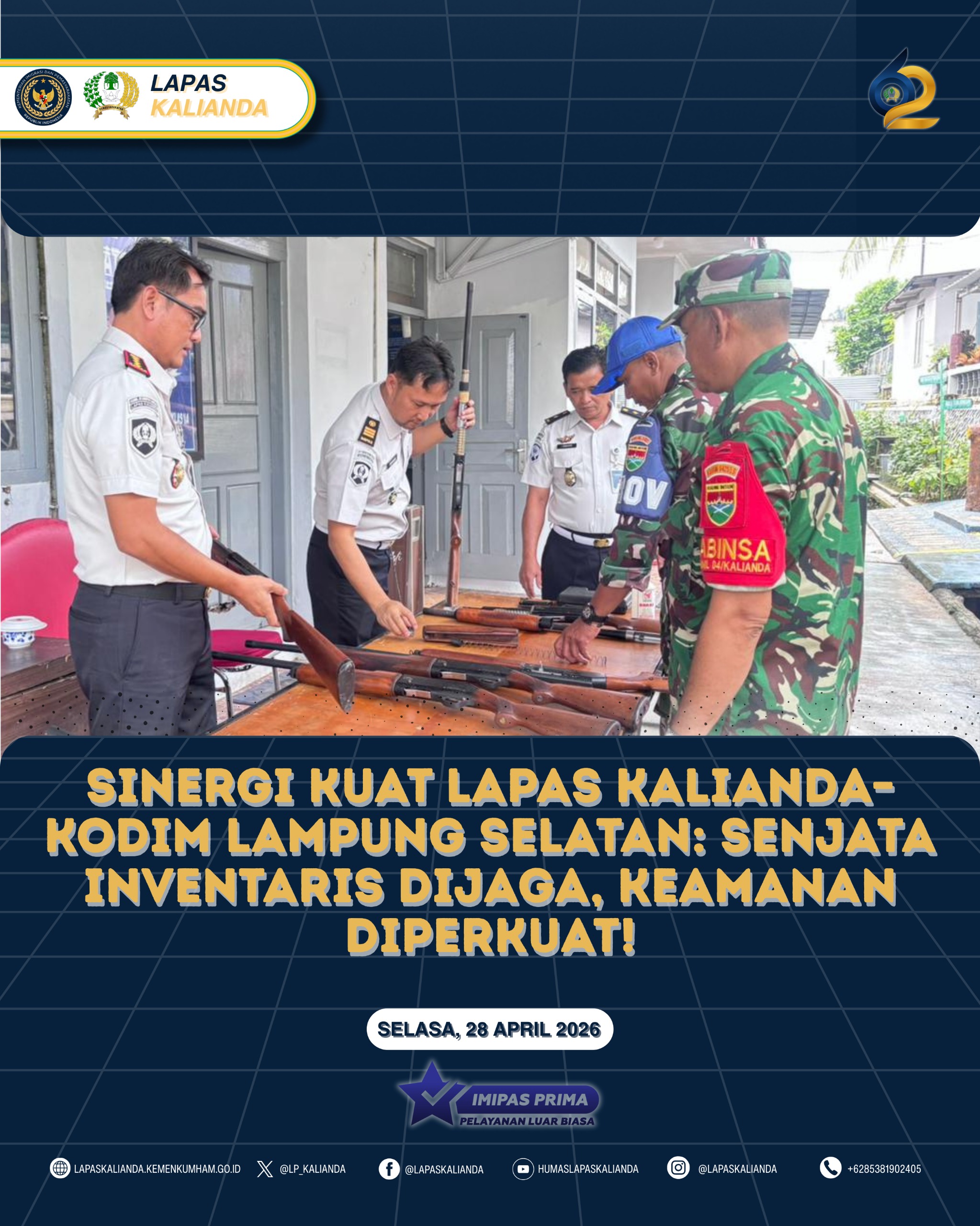 Kalianda – Lembaga Pemasyarakatan Kelas IIA Kalianda bekerjasama dengan Kodim 0421 Lampung Selatan melaksanakan kegiatan perawatan dan pemeliharaan senjata api inventaris yang dipimpin langsung oleh Kepala Lapas Kalianda sebagai bagian dari upaya menjaga kesiapsiagaan pengamanan di lingkungan Lapas (28/4).